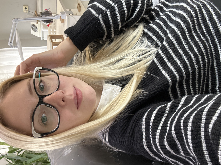 A blonde female, appearing to be a young adult, is centered in a medium shot, looking directly at the camera with a neutral expression. She has fair skin, green eyes, and wears black-framed glasses with white accents on the upper outer corners. Her long, straight blonde hair is loosely styled, with her left hand subtly touching the hair on the right side of her head. She is dressed in a black knitted sweater with multiple white horizontal stripes, worn over a white collared shirt. The indoor background suggests a professional setting, possibly a salon or studio. To the left, a dark object, likely a chair, and a portion of a green plant are visible. To the right, a white workstation features an articulated white desk lamp clamped to the surface, a square white device with a fan grille (consistent with a dust collector), and a fan-shaped holder displaying numerous colored nail polish swatches. A light-colored wooden stool or stand is also present on the desk. A power outlet with a plugged-in cord is visible on the light-colored wall above the desk, and a window with a sheer white curtain is partially seen in the upper right background. The specific location within the city of Voskresensk, Russia, is not discernible from the visual information presented in the image.