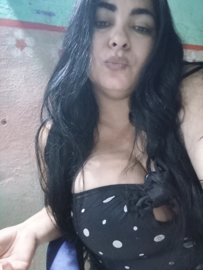 A female subject is depicted in a close-up, chest-up portrait, positioned against an interior wall in the city of Unknown, Unknown. The subject has long, dark, wavy hair that cascades over her shoulders. She possesses a light skin tone. Her lips are pursed in a "kissing" gesture, and her eyes are directed at the camera. She is attired in a strapless black top featuring white polka dots and a ruched black fabric detail on the upper chest. Her left forearm and partially open hand are visible in the lower-left portion of the frame. The background consists of a textured, light-colored wall with visible paint and markings. A horizontal band of light blue/teal paint runs across the top, with a narrower red/orange stripe immediately below it. Faded, reddish, star-like or floral patterns are discernible on the upper left wall. A small, dark circular indentation is present on the mid-left wall. The scene is illuminated by interior lighting.