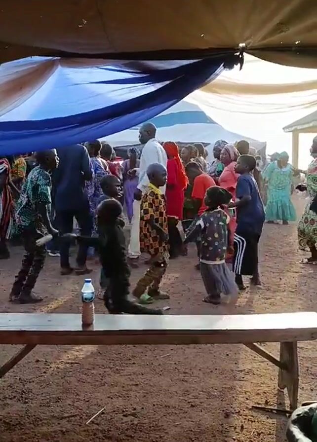 Several children and adults mill about in a dusty, open area, partially shaded by a tent-like structure with a draped blue sheet. A wooden table with a water bottle and some food on it stands in the foreground. Most of the people are wearing colorful clothing, and some appear to be dancing or moving to music. The overall atmosphere seems celebratory or festive.