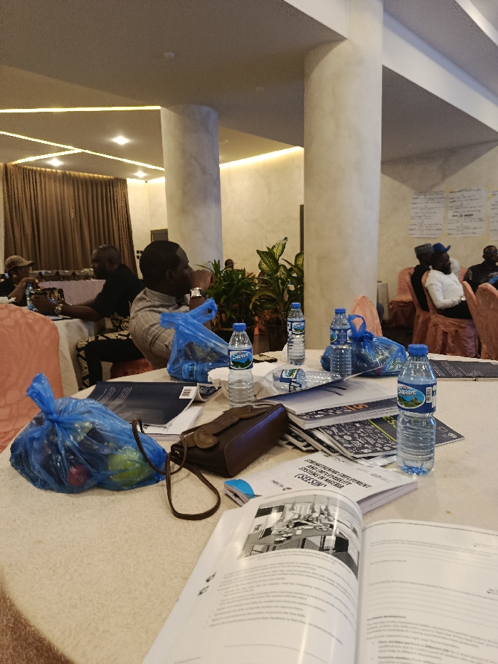 A conference room scene with a partially visible table covered in books, blue plastic bags, and water bottles. Men are seated around tables, some engaged in discussion. The room features pillars, curtains, and lighting fixtures. Posters are visible on the far wall. A plant adds a touch of greenery to the background. A brown purse is resting on the table near the plastic bags and books.