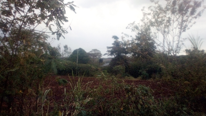 The image depicts an outdoor rural or semi-rural landscape located in Ndeiya, Kenya, under an overcast sky. The foreground features dense green foliage, including tall grasses and leafy plants, bordering an area of dark brown, tilled earth. This cultivated land extends into the mid-ground, surrounded by various green bushes and trees. In the background, a horizon line is visible, characterized by a dense cluster of trees and obscured elements, all beneath a uniformly light grey sky. No individuals, animals, or distinct man-made structures are discernible within the frame. The scene is static, devoid of observable actions or interactions.