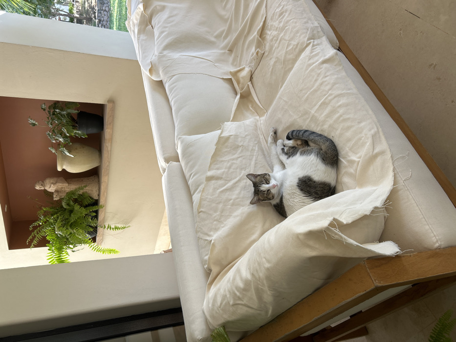 - "A cat lounges on a couch draped in off-white fabric" by FM-pPdqF3, licensed under CC BY 4.0