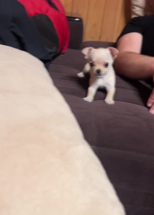 A chihuahua puppy is on a brown couch. It has light-tan colored fur and perked ears. A man is sitting on the couch next to the puppy, and his hand is near it. There is a beige pillow to the left of the puppy, and a red and black duffel bag is further left. The background consists of wood paneling. The puppy barks and approaches the man’s hand.