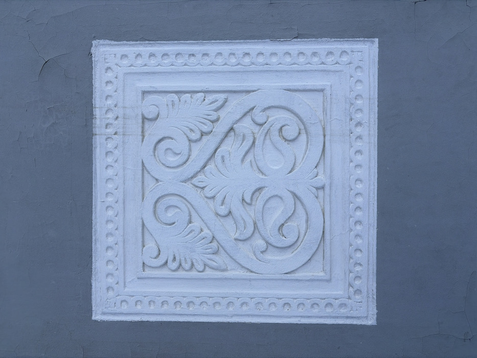 A white, square, decorative plaster relief adorns a gray wall