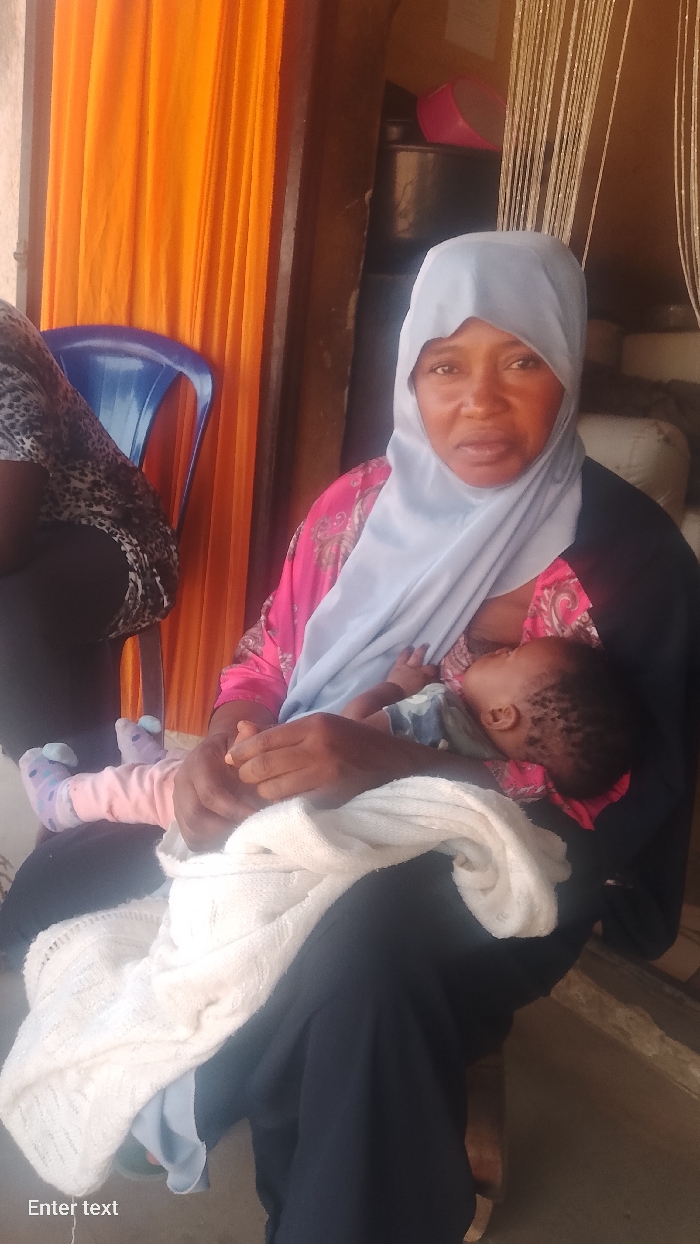 An adult woman is depicted seated indoors in Akwanga, Nigeria, holding an infant