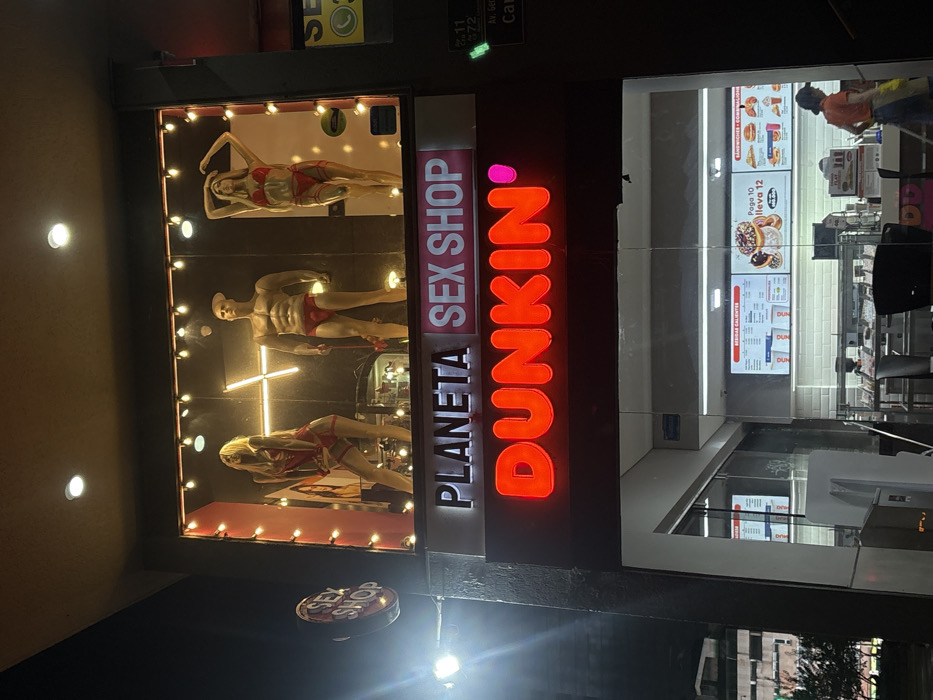 A storefront displays a jarring juxtaposition. On one side, mannequins in lingerie pose in a window labeled "Planeta Sex Shop". Next to this, the bright orange "Dunkin'" logo shines above the entrance to a Dunkin' restaurant. The contrast highlights the strange combination of services: explicit adult goods and a family-friendly donut chain in the same building or very close proximity. Street signs and a partial menu board for Dunkin' are also visible.