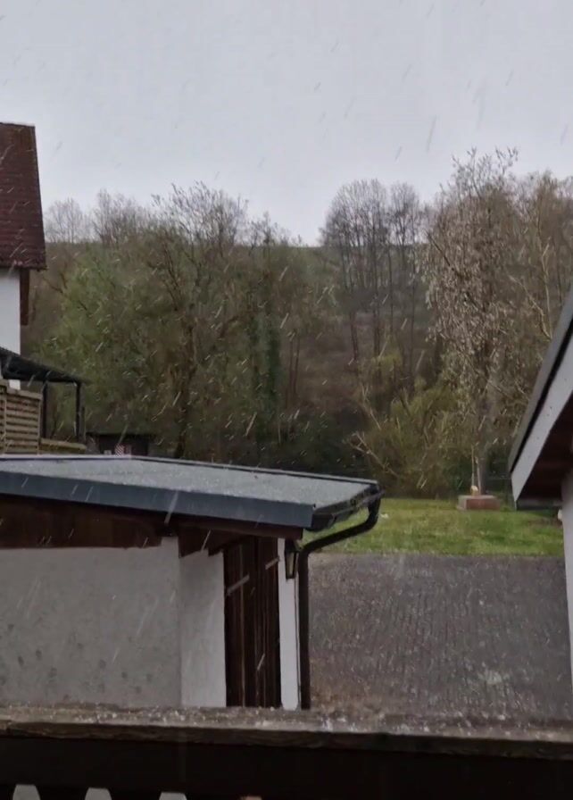 view from a balcony, during what appears to be a hailstorm or a mix of rain and snow