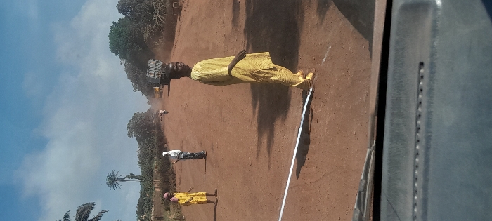 This image depicts a dusty, unpaved laterite road in Okura, Nigeria, viewed from inside a vehicle looking forward. The sky above is partly cloudy blue. In the immediate foreground, the top of a vehicle dashboard and windshield wipers are visible. A thick white line or object lies diagonally across the reddish-brown road surface directly in front of the viewer's vehicle. To the right of the foreground white line, a young male, dressed in a yellow long-sleeved tunic and yellow sandals, stands facing left, but has turned his head to look back towards the camera. He appears to have a small, dark object on his head. His right arm is bent, while his left arm is down. His shadow extends towards the left. Further into the scene on the left side of the road, two individuals are visible. One wears a yellow tunic similar to the foreground person, facing right. The other wears a white head covering and a dark patterned lower garment, facing right and looking forward. In the mid-ground, a motorcycle with a rider is visible traveling away from the camera in the center of the road, generating a significant dust cloud. Further down the road, at least two large trucks are also moving, creating additional dust. One truck appears to be heavily laden with cargo. The road is bordered by dense vegetation, including prominent palm trees on the left side and various other trees and shrubs along both edges, extending into the background. The overall environment is dry and dusty.