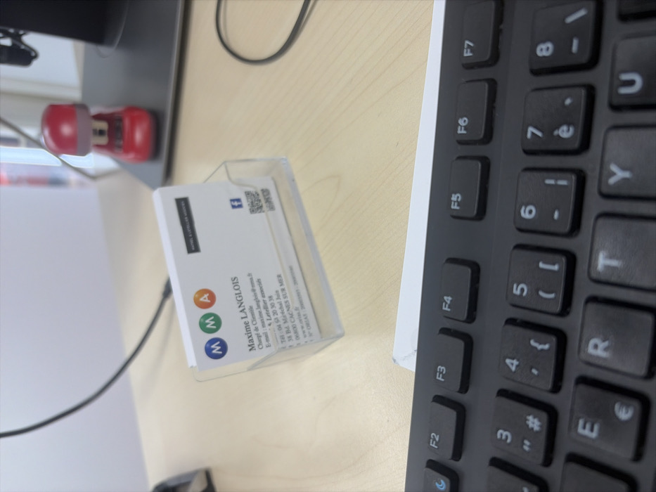 An interior shot depicts a light-colored wooden desk surface. In the mid-ground, a white business card for "Maxime LANGLOIS, Chargé de Clientèle" of "MMA Letellier associés" is displayed upright in a clear plastic holder. The business card includes contact information, a QR code, a Facebook icon, and specifies the address as "3B Bd Maréchal Juin, 06800 CAGNES SUR MER, France." To the right and rear of the business card, a small red object resembling a miniature vehicle or cartoon-like figure, potentially a stapler, rests next to the black base of a monitor stand. Black cables are visible across the desk surface. The foreground is occupied by the top section of a black computer keyboard with white legends, revealing function keys (F2-F7) and number keys (3-8). The background consists of a plain white wall.