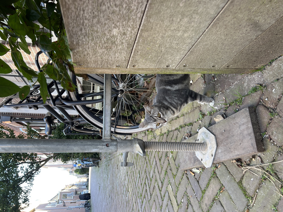 This image depicts an outdoor scene on a brick-paved street in Leiden, Netherlands. In the foreground-midground, a grey tabby cat with distinct dark stripes, light-colored paws, and yellow-green eyes stands partially obscured by a light-toned wooden planter box located on the right. The cat is looking directly towards the viewer. To the left of the cat, a metallic scaffolding jack, featuring a threaded shaft and a hexagonal base plate, rests upon a dark wooden plank positioned on the brick pavement. Behind this structure, a black bicycle with a front rack is parked. The street, paved with a herringbone pattern of light brown bricks, recedes into the background, flanked by traditional brick buildings. Scattered green vegetation is visible between the bricks and along the street, with additional bicycles parked further down the thoroughfare. The scene is illuminated by natural daylight.