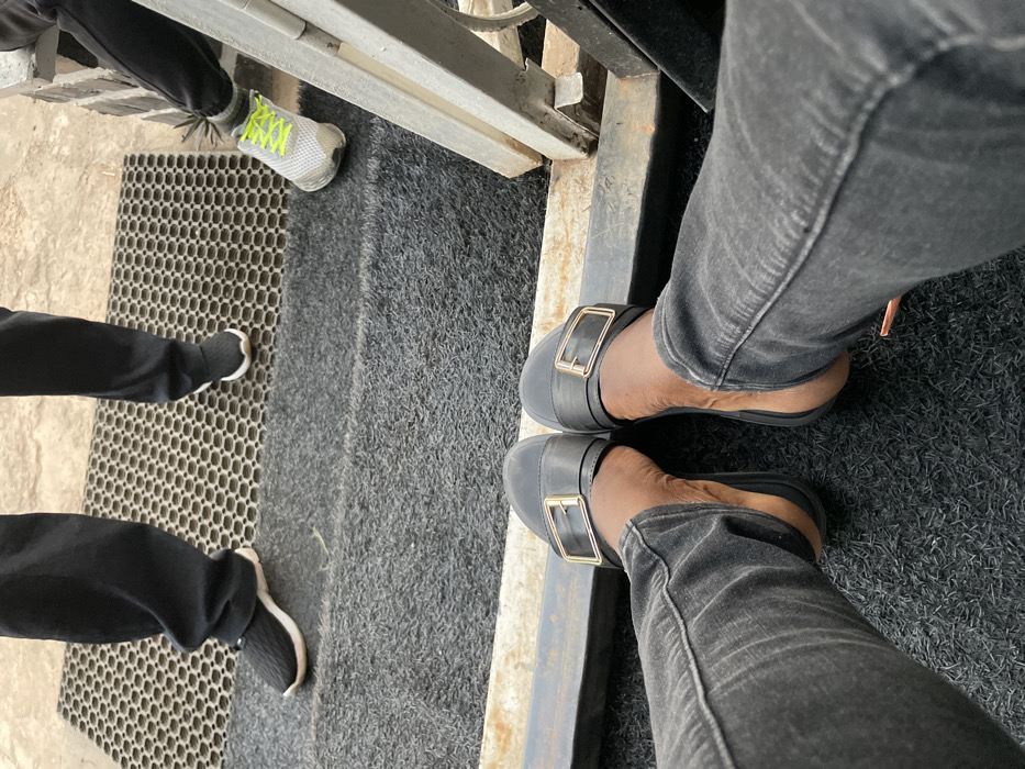 The image presents a first-person, downward-angled view, focusing on the feet and lower legs of three individuals in what appears to be an indoor or sheltered transitional area. In the immediate foreground, the viewer's legs are visible, clad in dark grey denim jeans. Their feet are positioned on a dark, possibly charcoal-grey, shaggy carpet or mat, wearing black slip-on flat shoes, each adorned with a rectangular gold-colored buckle over the instep. A dark, possibly metallic, horizontal bar or frame separates the foreground flooring from the background area. Beyond this bar, to the left, a person stands on a dark grey mat with a hexagonal grid pattern. This individual wears dark, possibly black, trousers and black sneakers with white soles. To the right, partially obstructed by a light-colored vertical metal support structure, another person stands on the same hexagonal grid mat. This individual wears dark trousers, possibly joggers, and light grey sneakers with distinctive bright neon yellow laces. No specific identifying features, landmarks, or signage are present in the image to determine an exact location within the city of Jos, Nigeria. The environment suggests a public space, possibly an entrance or waiting area, characterized by varied floor coverings.