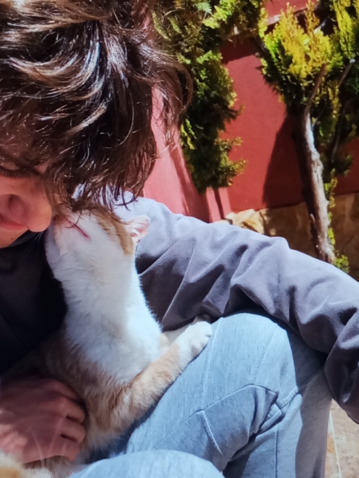 - "The image depicts a close-up, outdoor scene in Riga, Latvia, featuring a person and a bi-color cat under direct sunlight" by FM-1UPjC3, licensed under CC BY 4.0