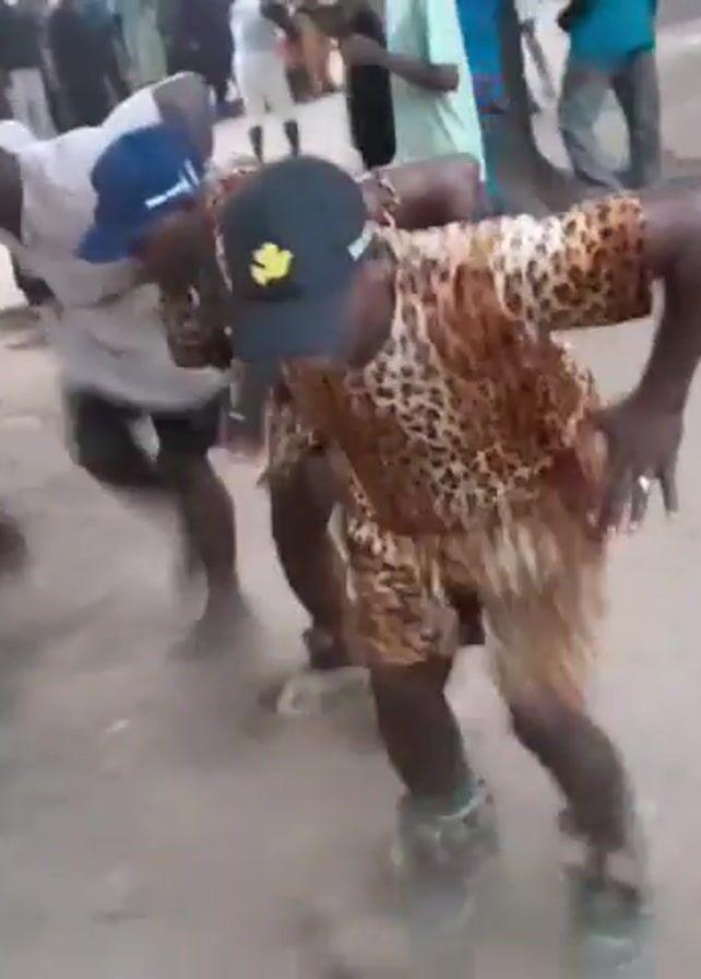 A group of men perform a traditional dance in a village setting. The dancers wear leopard-print clothing and baseball caps. Some of them have bells or noise-makers attached to their ankles. The dance involves rhythmic bending and swaying. Spectators watch from the background, creating a lively atmosphere. The setting seems to be a sandy ground in a village square with a tree in the background.