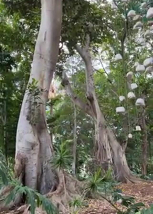 The camera pans upwards from a low angle, starting at the base of two massive, light-colored trees with sprawling roots and dense green foliage, to reveal a man-made structure consisting of numerous white, mushroom-shaped objects hanging from a green metal frame