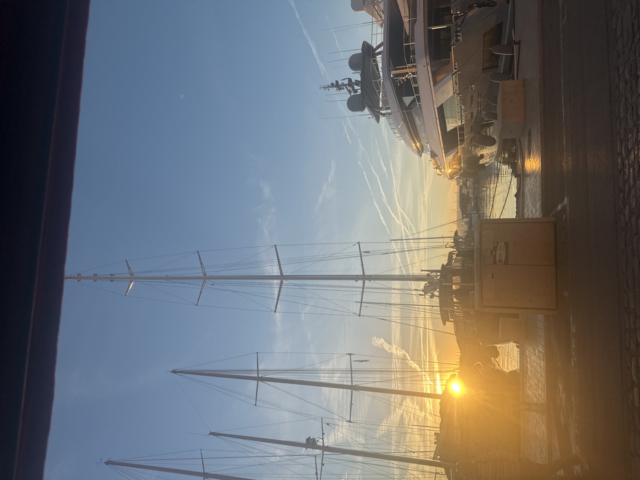 The image depicts a harbor scene in Saint-Tropez, France, during either sunrise or sunset, characterized by strong golden light. The upper portion of the frame shows a clear blue sky with numerous white contrails forming crisscrossing patterns; a faint crescent moon is visible in the upper-right quadrant. A dark, horizontal bar partially obstructs the very top of the view. The sun, a bright, overexposed orb, is positioned low on the left horizon, casting significant lens flare and a golden hue across the scene. In the mid-ground, multiple large vessels are docked along a quay. On the left, at least three large sailing yachts are visible, distinguished by their tall, slender masts and intricate rigging, largely silhouetted against the sun. To the right, a multi-deck motor yacht (superyacht) with a light-colored hull, numerous windows, radar domes, and communication equipment on its superstructure is prominently moored. Fenders are visible along its starboard side. The foreground consists of a dark-colored, paved quay or pier, which appears wet or highly reflective, mirroring the golden light. On the quay, centrally located, is a large, light-colored, box-like utility structure, possibly a service pedestal. Mooring bollards are positioned along the quay edge, particularly near the motor yacht. A partially visible individual, silhouetted and mostly obscured by the intense light, is walking on the far-left side of the quay, moving towards the right. The harbor water is calm, reflecting the golden light from the low sun.