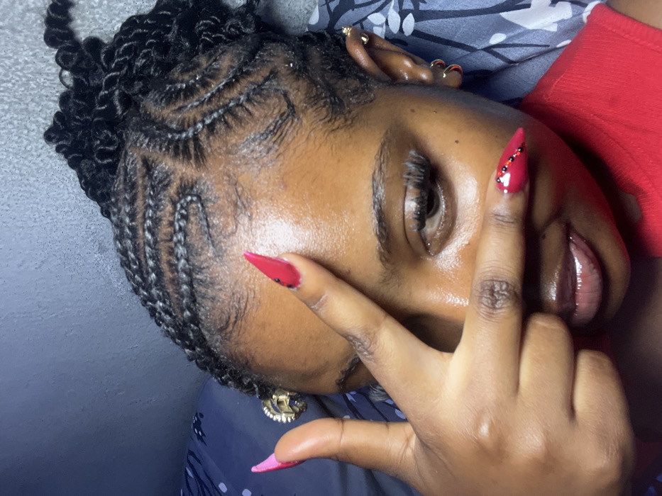 A close-up image depicts an individual in an indoor setting in Asipa, Nigeria. The subject, possessing dark skin, has black hair styled in distinct cornrows across the scalp, transitioning into a textured updo, with carefully laid edges. The left hand (viewer's right) is raised, with fingers partially splayed, obscuring the central portion of the face from the nose to the right eye. The right eye (viewer's left) is visible, featuring prominent eyelashes. The mouth is slightly parted, revealing glossy lips and the tip of the tongue. The visible thumb on the left hand displays a long, pointed, bright pink artificial nail. The index finger of the right hand (viewer's left) has a long, pointed, dark red artificial nail adorned with a linear pattern of small black and red beads. The right ear (viewer's left) is partially visible, accessorized with multiple gold-toned hoop earrings and a helix piercing. A red garment is worn on the torso. The background consists of a dark blue fabric with a subtle light-colored pattern on the sides, likely bedding, against a plain, dark-colored wall.