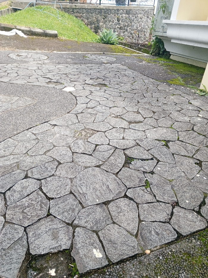 A gray stone pathway made of irregular polygonal pieces fills most of the frame