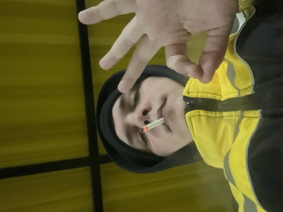 A male individual, appearing young, is depicted in a close-up, low-angle selfie. He wears a black hooded sweatshirt under a yellow and black jacket featuring grey reflective stripes. A lit cigarette is present in his mouth, positioned horizontally. His right hand is raised to the foreground, forming an "OK" gesture with the thumb and forefinger creating a circle, and the remaining three fingers extended upwards. The background consists of a uniformly yellow, corrugated metal surface with dark horizontal and vertical structural elements. The scene is located in the city of Lupanovo, Russia.