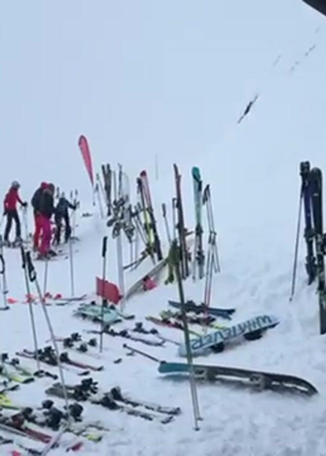 snowy mountain scene, likely at a ski resort. Numerous skis and ski poles are stuck in the snow near what appears to be a building with a covered area. In the background, a group of people are skiing or snowboarding on a slope. The weather is overcast, with limited visibility. A young man is briefly seen on a deck looking out at the scene, and there are several flags visible behind him. The flags appear to be French and Swiss. Snow is actively falling.
