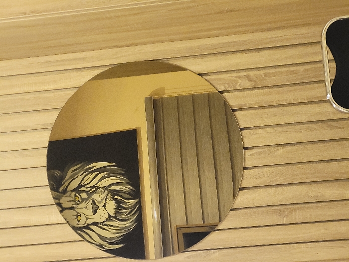 The scene is an interior view in Galadimawa, Nigeria. A circular mirror is mounted on a light-toned wall composed of vertical wooden slats. The mirror reflects several interior elements: in the upper left, a framed artwork depicting a stylized lion's head with a light-colored mane and yellow eyes against a dark background is visible. To the immediate right of this, a plain yellow wall is reflected. Below these reflections, a horizontal structure resembling window blinds or a slatted panel is visible, with a small dark rectangular opening reflected in the lower left portion of the mirror. In the lower foreground, beneath the mirror, the top edge and a portion of the black backrest of a chair with a metallic frame are visible.