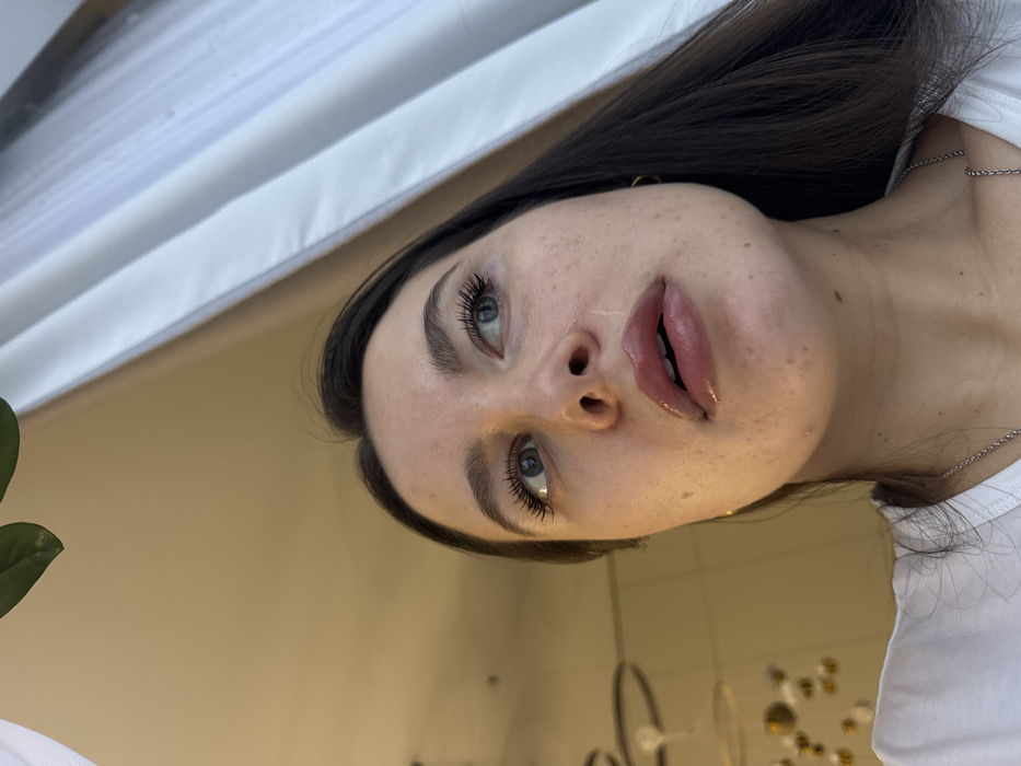 The image depicts a close-up, low-angle shot of a female individual in an indoor setting. The individual has fair skin with visible freckles, long dark hair partially visible on the right, and blue eyes. Her eyelashes appear to have mascara applied. A tear is visible on her right cheek, tracking downwards from the inner corner of the eye, and another clear liquid drop is present near her left philtrum. Her lips are slightly parted and have a glossy appearance. She is wearing a white t-shirt and a silver-toned chain necklace. Her gaze is directed upwards and slightly to the right of the frame. In the blurred background, a light-colored ceiling is visible, along with multiple decorative light fixtures; one appears as a large dark circular ring, and another comprises several small, spherical, golden-toned objects. White, vertically pleated curtains or blinds are visible on the far right, suggesting a window. A green plant leaf is partially visible in the upper left corner. The scene is an indoor environment, potentially located in Odintsovo, Russia, although no specific geographical identifiers are discernible within the image itself.