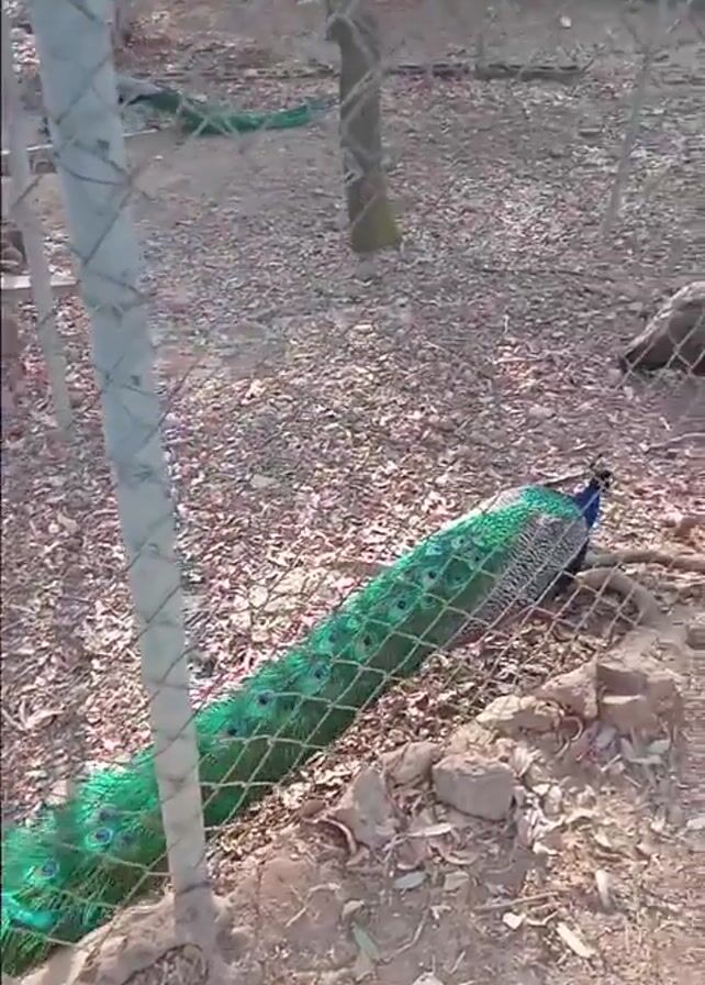 The camera pans from right to left, revealing peacocks in a wired enclosure