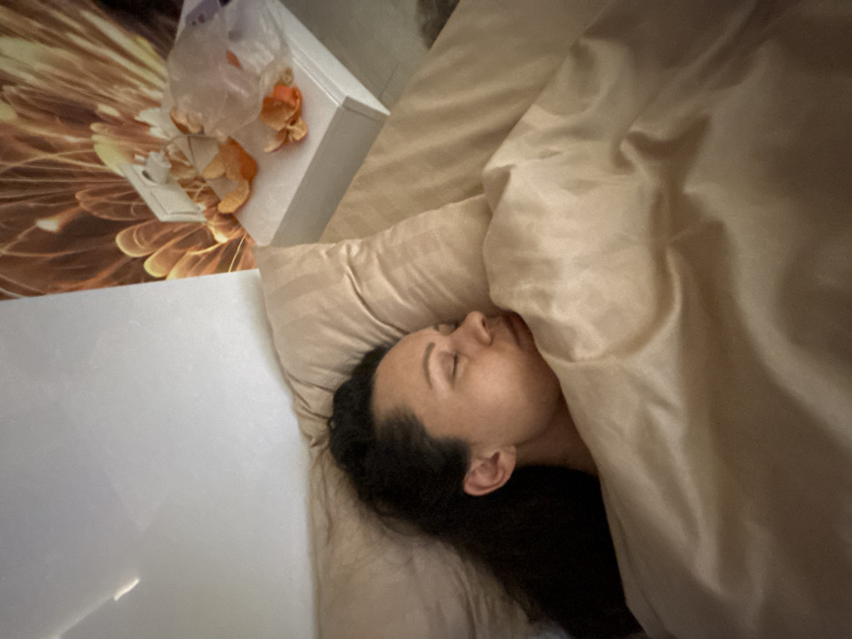 A woman sleeps in bed, covered by a beige blanket. Her face is visible on a beige pillow, with dark hair fanned out around her head. A white nightstand sits next to the bed, adorned with an orange and brown patterned decoration. A clear plastic bag sits atop the nightstand. A white wall is visible on the left side of the frame.