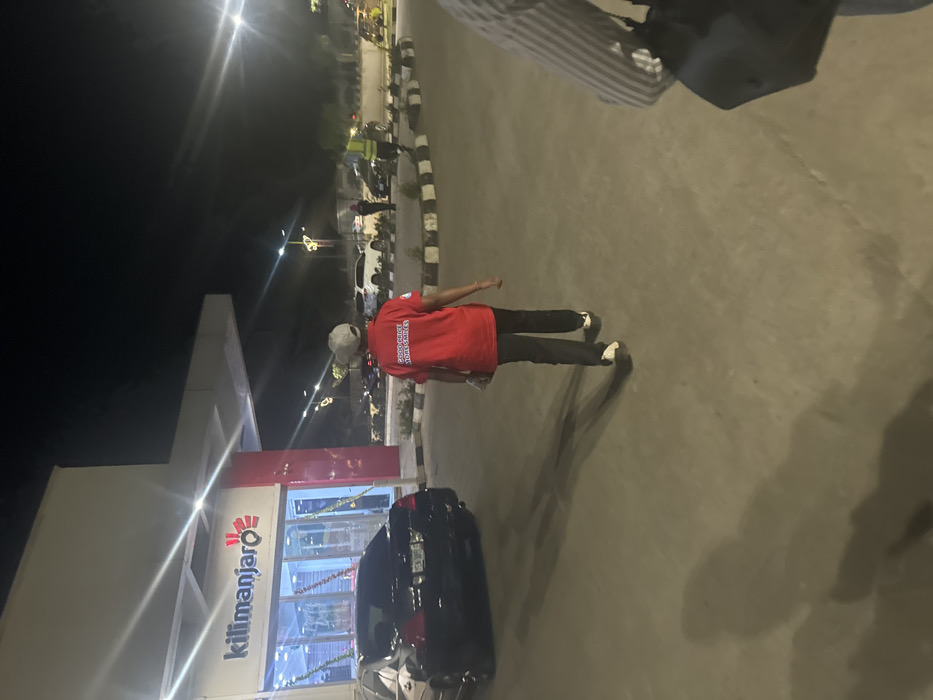 A person in a red shirt and cap walks on a paved area outside a building labeled "Kilimanjaro". The building appears to be a retail establishment. A black car is parked nearby. The scene is illuminated by streetlights, indicating it's nighttime. The composition includes the person's back, the store's facade, and other cars parked further away. The image is taken at a tilted angle.
