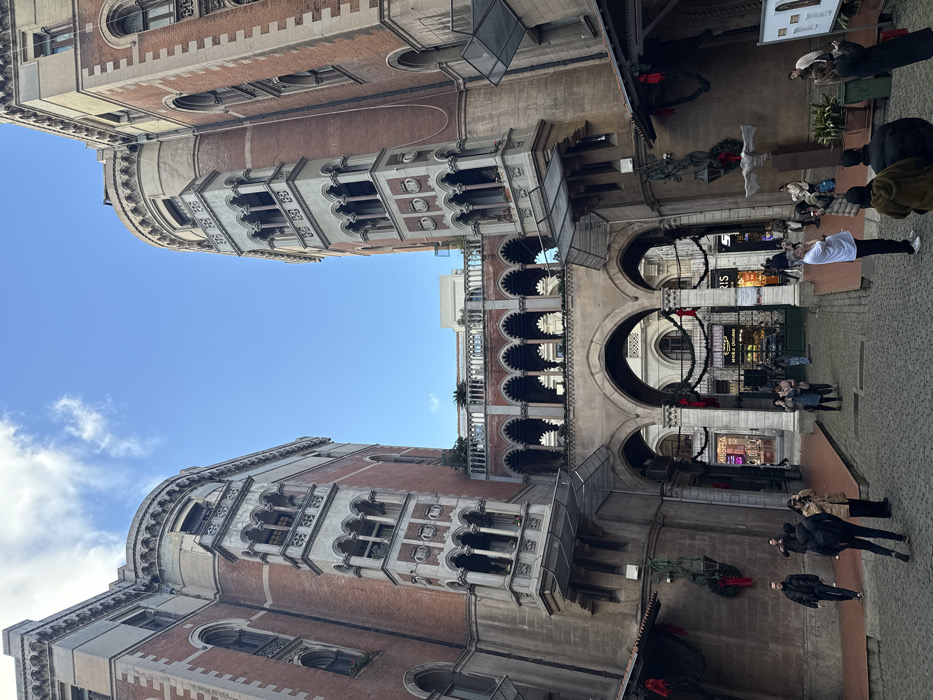 The image displays the interior courtyard of Çiçek Pasajı (Flower Passage) within the Beyoğlu district of Istanbul, Turkey. Two imposing multi-story buildings, characterized by red brick facades and intricate light-colored stone details, frame the cobblestone-paved passage. Both structures feature elaborate bay windows and balconies adorned with carved arches, columns, and balustrades. An elevated, arched walkway connects the upper levels of the flanking buildings, while ground-level arches lead further into the passage. Green garlands accented with red bows are draped along the lower archways and architectural features, suggesting a festive period. Approximately two dozen individuals are present in the courtyard and adjacent passage. They are observed walking, standing, and engaging with their surroundings; several individuals appear to be photographing the architecture with mobile phones. Beyond the primary arches, visible shopfronts include "MISSHA," "IRIS," and "SKETCHERS." A dark, sculptural figure, possibly winged, stands to the right near a planted area. The scene is illuminated by natural daylight under a predominantly clear blue sky with scattered white clouds.