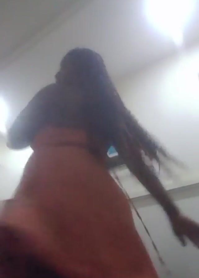 A person with dark skin and braided hair is dancing in a brightly lit room. They are wearing a red dress with buttons down the front. The camera is pointing up at them from a low angle. The person raises their arms and twirls. There is a light fixture on the ceiling and a window on the wall behind them.