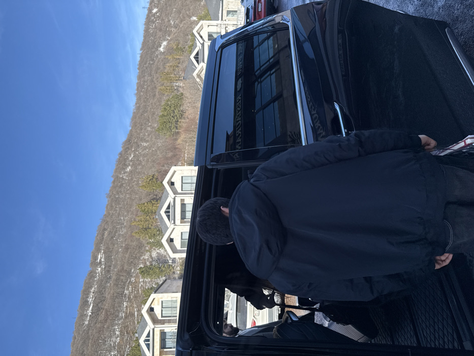 The scene depicts an outdoor daytime setting in Tsakhkadzor, Armenia, under a clear blue sky. In the foreground, a person, viewed from behind, wears a dark navy blue hooded puffer jacket and dark pants, standing at the open passenger-side sliding door of a black multi-purpose vehicle (MPV). The person's left hand is near a white and red striped object, possibly a bag. Through the open door of the black vehicle, a bearded individual in a dark jacket is partially visible further back, next to a white SUV with an open door. This individual appears to be interacting with the white SUV or an item near it. A third person's hand is also visible inside the black vehicle, near the rear opening. The background features several modern, light-colored residential-style buildings with dark, sloped roofs and large windows, arranged on a gentle incline. Behind the buildings, a large mountain rises, sparsely covered with leafless deciduous trees and patches of snow, indicating a winter or early spring environment. Several green conifer trees are interspersed among the buildings and on the lower slopes of the mountain. The ground surface is dark and reflective, suggesting pavement or asphalt. Reflections on the black vehicle's windows show inverted text, possibly part of a "RESTAURANT" sign, further detailing the immediate surroundings.