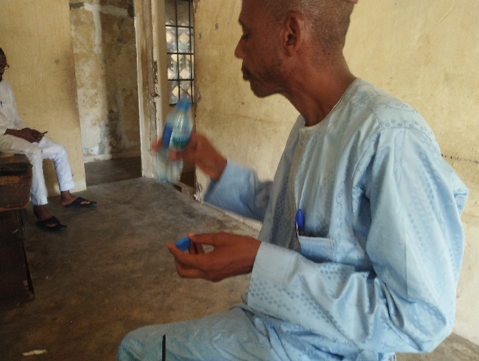 man sitting on a floor in a room in Kaltungo, Nigeria, at coordinates 9.816, 11.315. He is wearing a blue long-sleeved shirt and is holding a plastic bottle with a blue cap in his right hand. He is looking down at the bottle and is about to open it with his left hand. Another man is sitting on the floor in the background wearing a white shirt. There is a wooden table on the left side of the image and a door in the background. The room is dimly lit and the floor is made of concrete.