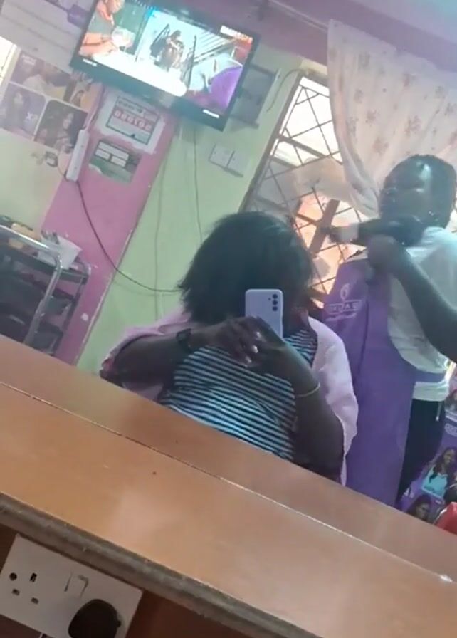 From the mirror's reflection in what appears to be a salon, a person in a white-and-purple uniform is using a hair dryer on a customer's hair