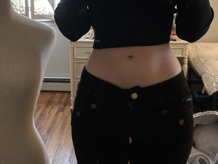 - "A woman with a bare midriff is wearing a cropped black top and low-rise black pants with buttons" by FM-KXBwv1, licensed under CC BY 4.0