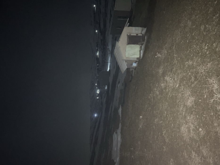 At night, a small building with an adjacent shed sits next to a grassy area. Across from the building, faint lights illuminate a distant ridge or street. The sky is dark, with no visible celestial bodies. The scene lacks detail due to the low lighting conditions, causing most of the background to fade into darkness.