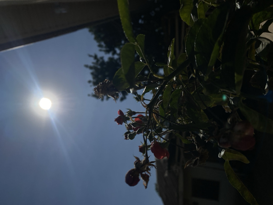 The scene depicts an outdoor environment on Rukuba Road, Nigeria. A clear blue sky occupies the upper portion of the image, featuring a bright, high-positioned sun with prominent lens flares. In the foreground and mid-ground, a flowering plant, characterized by dark green leaves, several small red rosebuds, and dried floral remnants, is present and partially silhouetted against the sun. In the distant background to the left, a light-colored building with a reddish-brown roof and a dark rectangular window is partially visible. Dark green tree foliage is present in the background to the right. An architectural element, appearing as a light-colored structure, is visible in the upper right quadrant of the image. No individuals are depicted.
