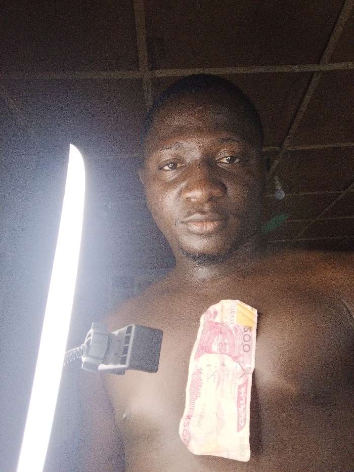 A dark-skinned adult male is depicted from the chest up, positioned centrally in the frame. He is shirtless. A crumpled 500 Nigerian Naira banknote is visibly affixed to his bare chest, slightly right of center. To the left of the male subject, a vertically oriented, illuminated fluorescent tube light is present, with a dark electrical connector attached near its lower portion. The man gazes directly forward with a neutral expression. The background is dark, revealing a ceiling with dark, visible structural beams or slats above the man's head. The scene is presumed to be indoors in Akwanga, Nigeria.