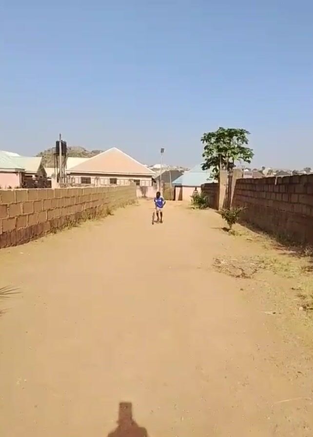 A young boy, wearing a blue and white t-shirt and khaki shorts, is running down a dirt road towards the camera. He is pushing a bicycle wheel in front of him with a stick. The road is lined with brick walls on either side, and there are houses visible in the background. The sky is clear and blue. The shadow of the person recording the video is visible in the foreground. The boy smiles and gives a wave as he approaches.