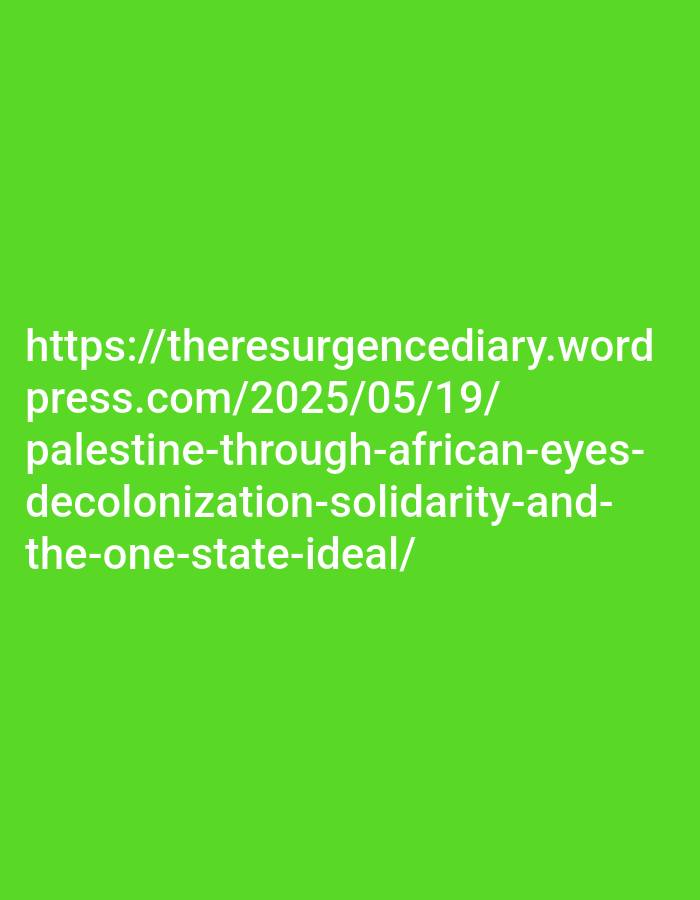 The image is a solid green background with white text that reads: "https://theresurgencediary.wordpress.com/2025/05/19/palestine-through-african-eyes-decolonization-solidarity-and-the-one-state-ideal/" The coordinates provided, -1.245 latitude, 36.691 longitude, correspond to a location in Rungiri, Kenya. There are no people, objects, or actions present in this image.