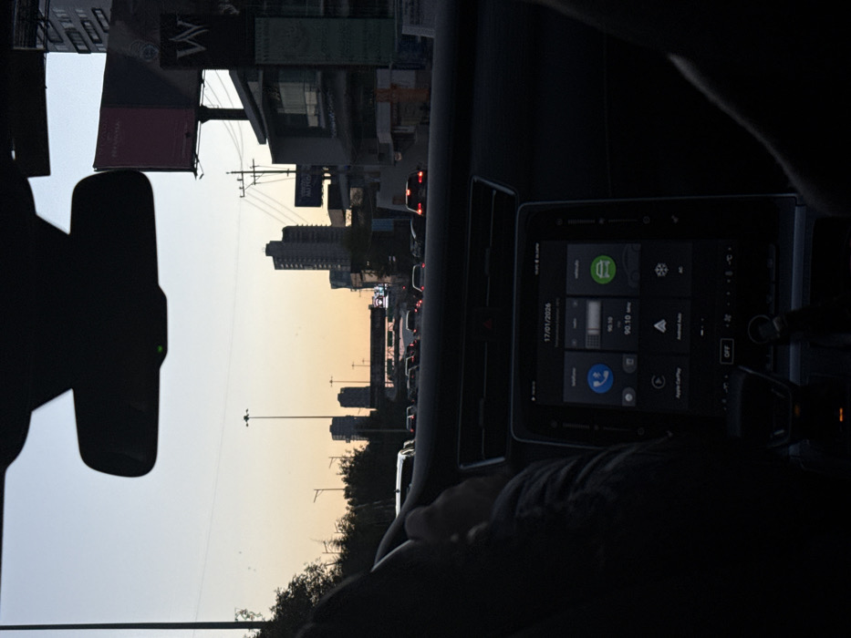 From within a car, the view is of an urban street at dusk. Buildings line the road, with denser buildings visible in the distance. The sky transitions from light to a pale orange. A car's digital display screen is visible, showing various icons and information such as the date "17/01/2026" and a radio frequency of "90.10". The rearview mirror is visible on the left. The interior of the car is dark, with the driver's hands on the wheel.