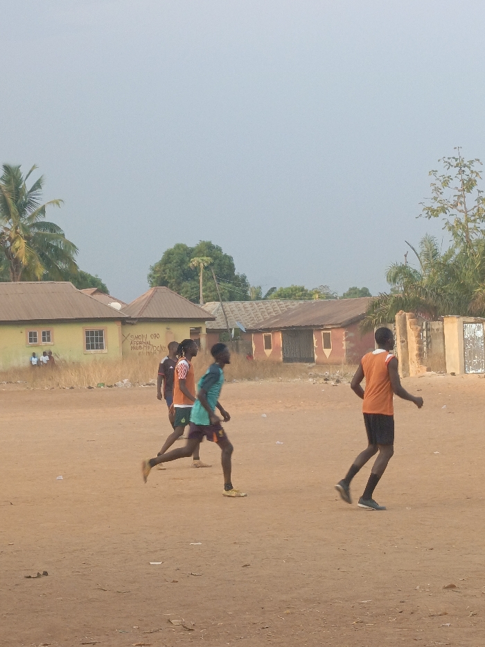 This image depicts an outdoor scene in Akwanga, Nigeria, on a reddish-brown dirt field under a light blue, hazy sky