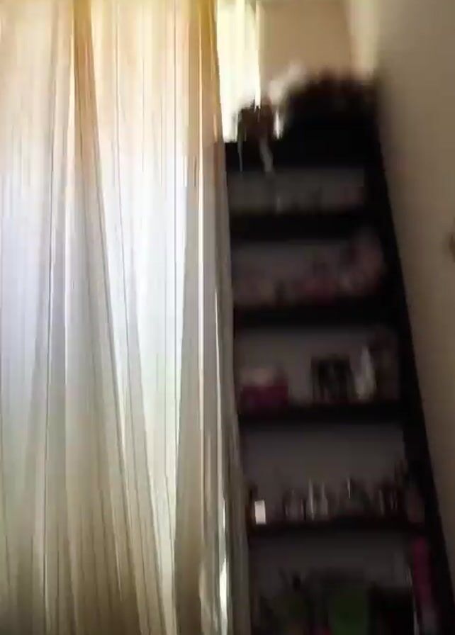 Here's a concise description of the video: The video starts with a view looking upward in a room with light-colored curtains hanging by a window, and a tall, dark-colored shelf against a white wall