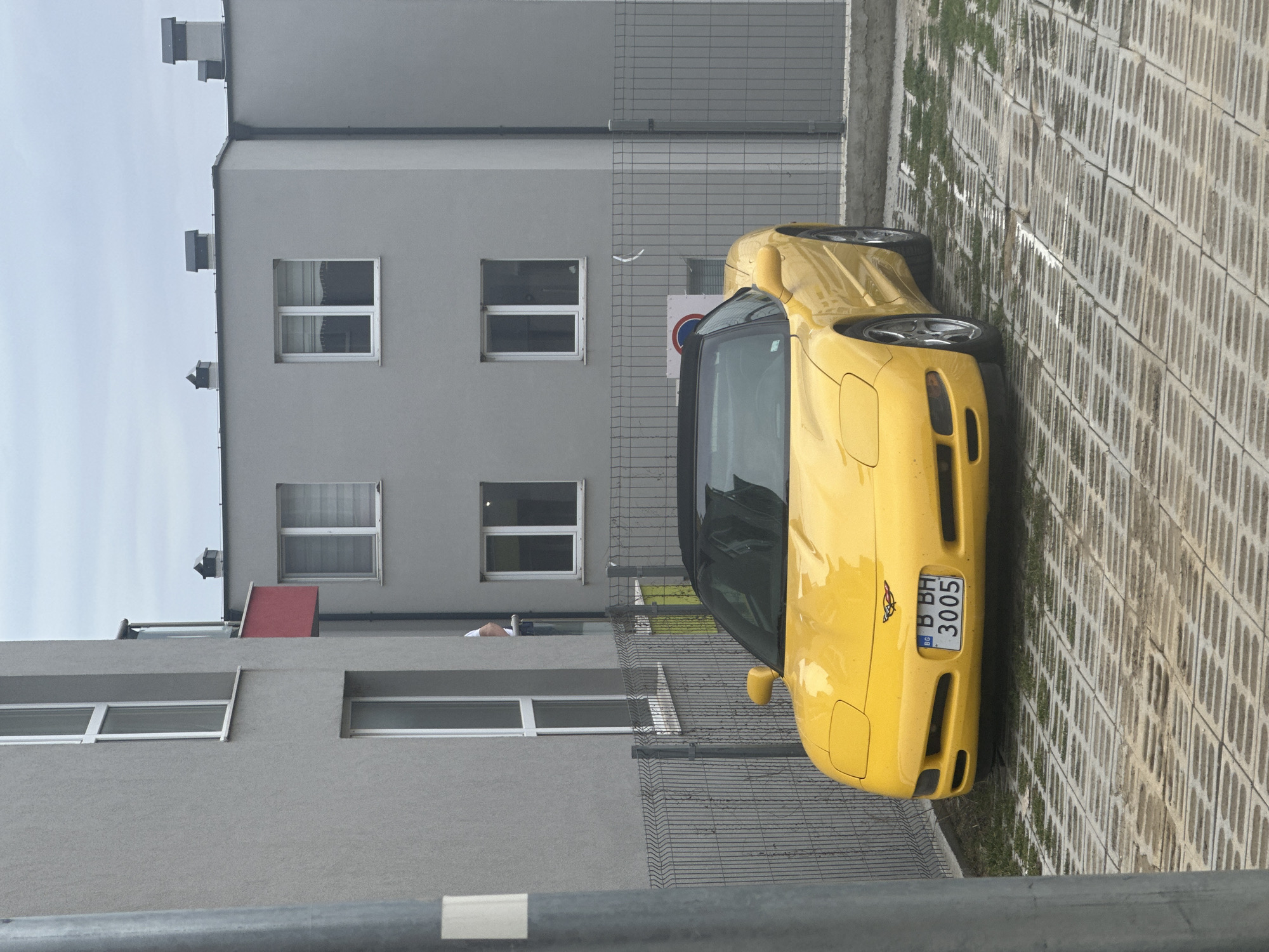 - "The scene depicts a yellow C5 Chevrolet Corvette convertible with a black soft top, parked on a ground-level concrete paver surface containing patches of grass" by FM-e4GMx2, licensed under CC BY 4.0