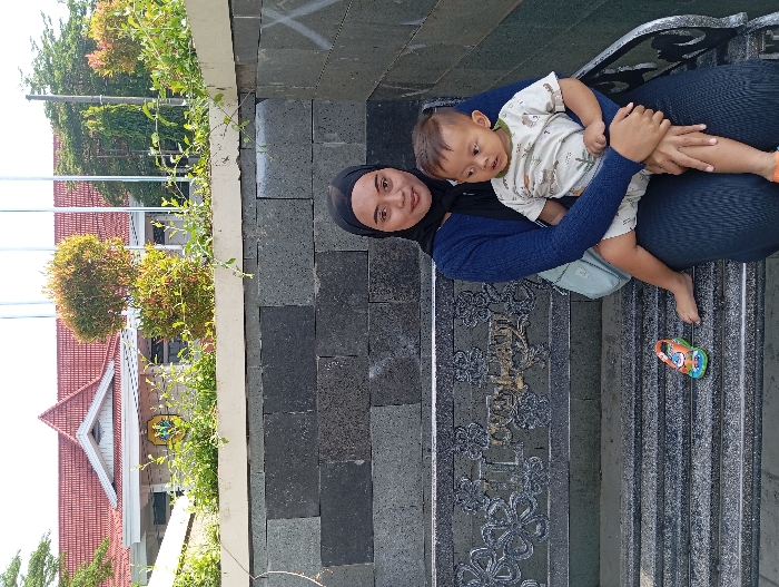 An adult female and a male infant are seated on a dark gray ornamental bench in an outdoor public space within Kecamatan Pati, Indonesia. The female, wearing a black hijab, a dark blue long-sleeved top, and dark trousers, holds the infant on her lap with her left arm. She presents a slight smile while looking directly at the viewer. The infant, barefoot and dressed in a light-colored, patterned short-sleeved t-shirt and light-colored shorts, is looking towards the right of the frame. A light blue sling bag hangs from the female's left shoulder. A pair of orange, green, and blue children's sandals rests on the bench to the left of the infant. The bench's backrest is adorned with metallic floral patterns and an inscription displaying "I ❤️ PATI". Behind the subjects and the bench is a dark gray stone block wall, topped by a planter containing green foliage and small bushes with reddish-green leaves. In the background, a building with a red tiled roof, white trim, and a central triangular gable is visible, featuring a yellow and blue circular emblem on its facade. Multiple white flagpoles and additional distant foliage are present behind the building, under natural daylight conditions.