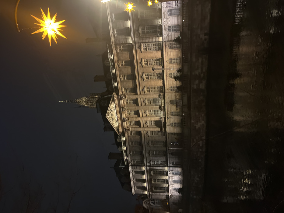 A night scene shows a multi-story building with ornate architecture, many windows, and a triangular pediment. The building is reflected in a dark body of water. Christmas star light fixtures illuminate the scene. A church spire is visible behind the building.