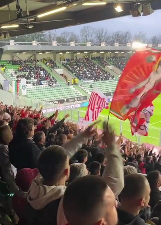 crowd of soccer fans at a stadium. Most of the crowd has their arms raised, and many are waving flags. The flags are red and white, and some have the image of a person on them. The stadium has green seating and bright stadium lighting. There are advertisements along the back wall. The fans are of different ages.