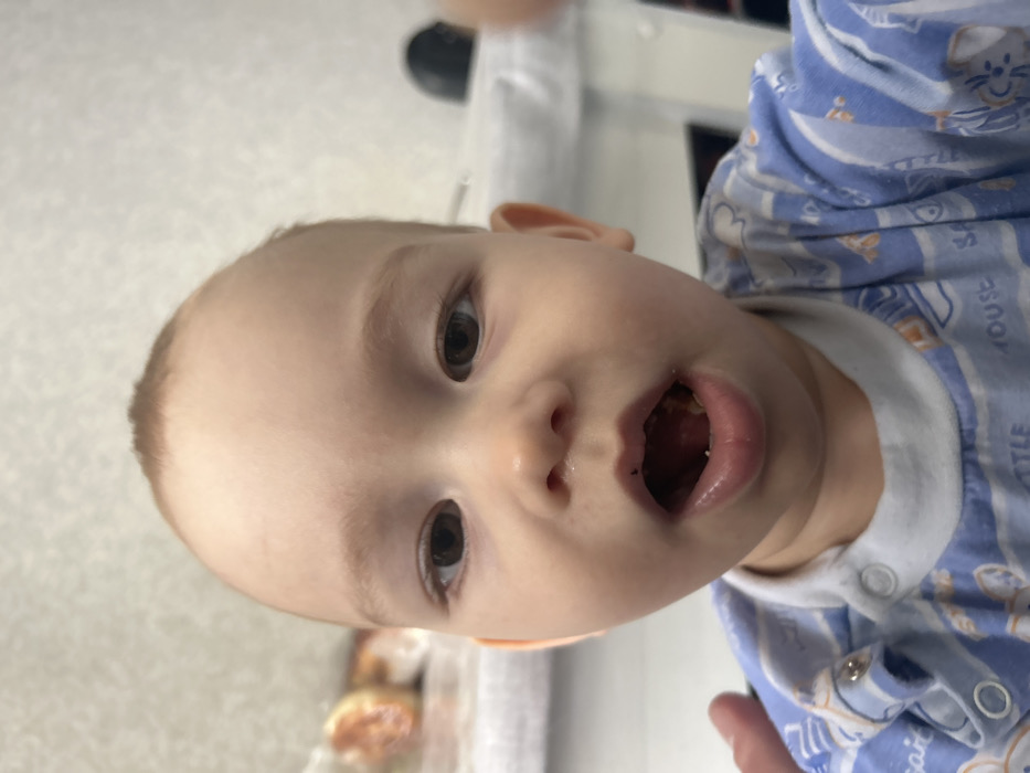 An image taken in Chusovoy, Russia, shows a close-up, head-on view of a light-skinned infant or toddler. The child has light brown hair, dark eyes, and a slight reddish mark on the forehead. The child's mouth is open, revealing chewed food particles, possibly crumbs, on the tongue and lower gums. A small, dark, granular object is visible on the philtrum above the upper lip. The child is wearing a blue and white patterned long-sleeved garment, possibly a onesie, with snap buttons on the collar. A portion of an adult's thumb or finger is visible at the lower-left edge of the frame, near the child's left shoulder. The background is out of focus; to the left, blurry items resembling baked goods in clear packaging are visible on a surface, against a light-colored wall with a subtle pattern. To the right, another light-colored wall and indistinct objects, including a dark shape and a white surface, are present.