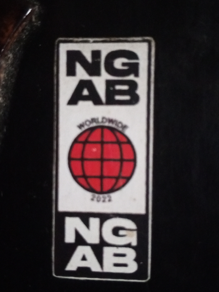 A rectangular sticker, approximately vertically oriented, is affixed to a dark, non-reflective surface. The sticker features a white background with a black border. At the top, the text "NG AB" is prominently displayed in large, bold, black sans-serif capital letters. Centered below this, the word "WORLDWIDE" is printed in a smaller, arched font above a red globe graphic with a black grid pattern. Beneath the globe, the number "2022" is visible in small, black text. The bottom section of the sticker contains the text "NG AB" in large, bold, white sans-serif capital letters, set against a solid black rectangular background that is integrated into the sticker's design. The sticker exhibits minor surface wear and slight blurring of finer details. No individuals or active interactions are present in the frame. The scene is located in the city of Unknown, Indonesia.