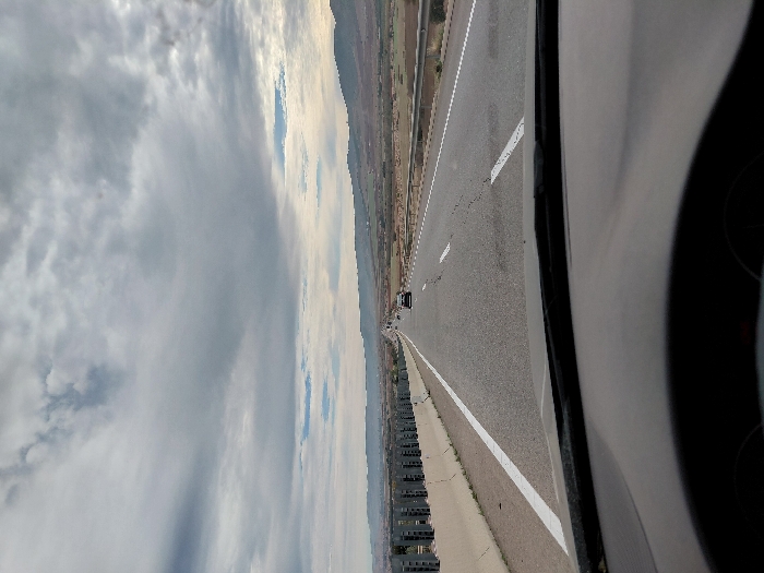 A tilted image showcases a highway stretching into the distance. On the left, a cloud-filled sky meets land featuring rows of buildings. The highway has a white dividing line and several vehicles can be seen in the distance. The right side of the image includes a portion of a vehicle interior, likely the dashboard and steering wheel, suggesting the photo was taken from inside a car.