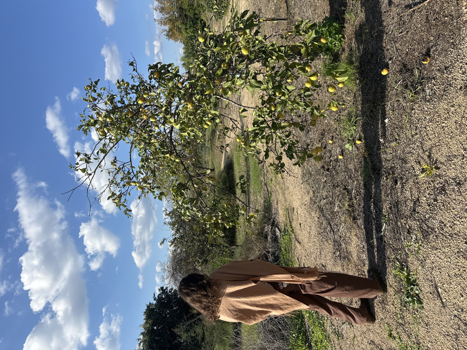 An outdoor scene in Beit Yitshak Sha'ar Hefer, Israel, depicts a single individual observed from behind, standing on a light brown dirt path. The person has long, wavy, dark brown hair and is dressed in a light tan, fringed poncho-style top over dark brown trousers and dark footwear. They are positioned on the left side of the frame, facing away from the camera, looking towards a prominent lemon tree laden with numerous yellow lemons and green leaves, situated to the right of the path. Several ripe lemons are visible on the ground beneath the tree. The background features additional trees and sparse green vegetation, suggesting an orchard or rural setting. The sky is bright blue with scattered white cumulus clouds, indicating clear, sunny weather. Shadows cast by the person and the tree are distinct on the ground.